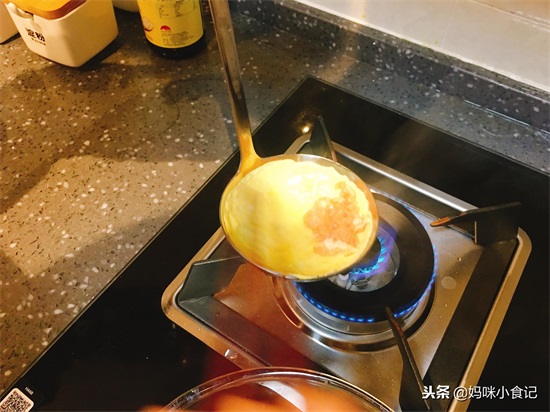 将打好的蛋液舀到勺子里,迅速转动勺子,形成一张薄薄的蛋饺皮