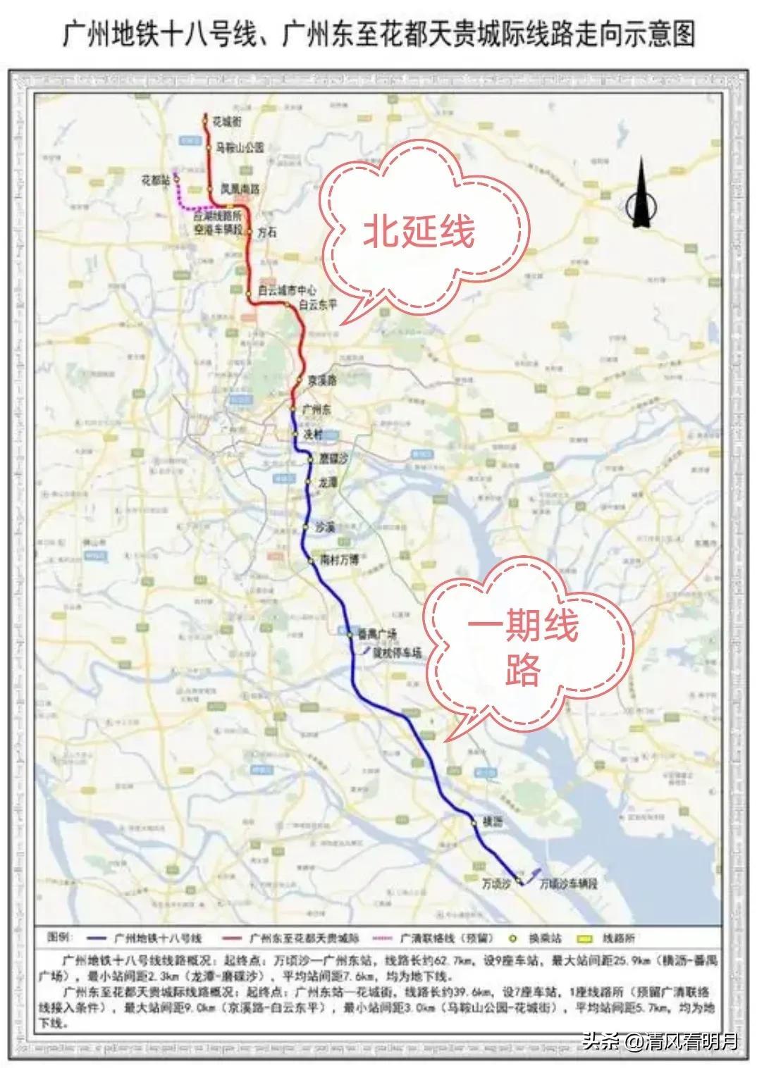 18号线剩余两部分分别为北延线和南延线。北延线全长约38.5km,从广州东站到花都天贵路,为全地下线路,设站7座,站站均可换乘。经天河区、白云区、花都区,串联同和总部服务区、京溪科技创新区、空港经济区、白云城市中心、空铁联合发展核心区、花都中心城区、融创文旅城片区。