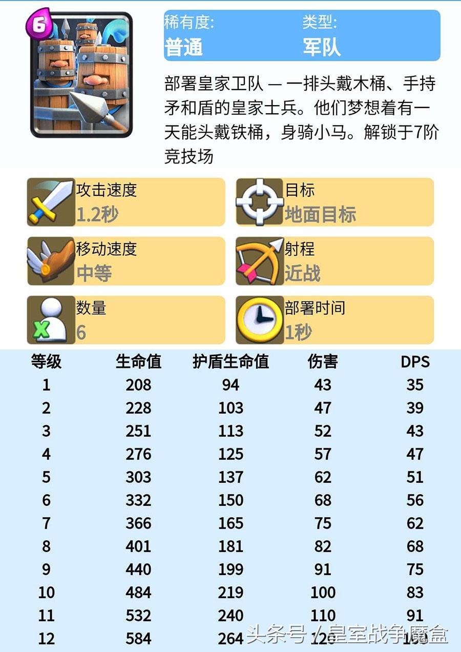 皇家卫队最具特色之处是数量为6,下牌后可以站成一排,横跨战场。你既可以拿他分路防守,也可以拿他分路进攻。皇家卫队耗费6滴圣水,由于卡牌特殊性,小编觉得下牌难度有点大。
