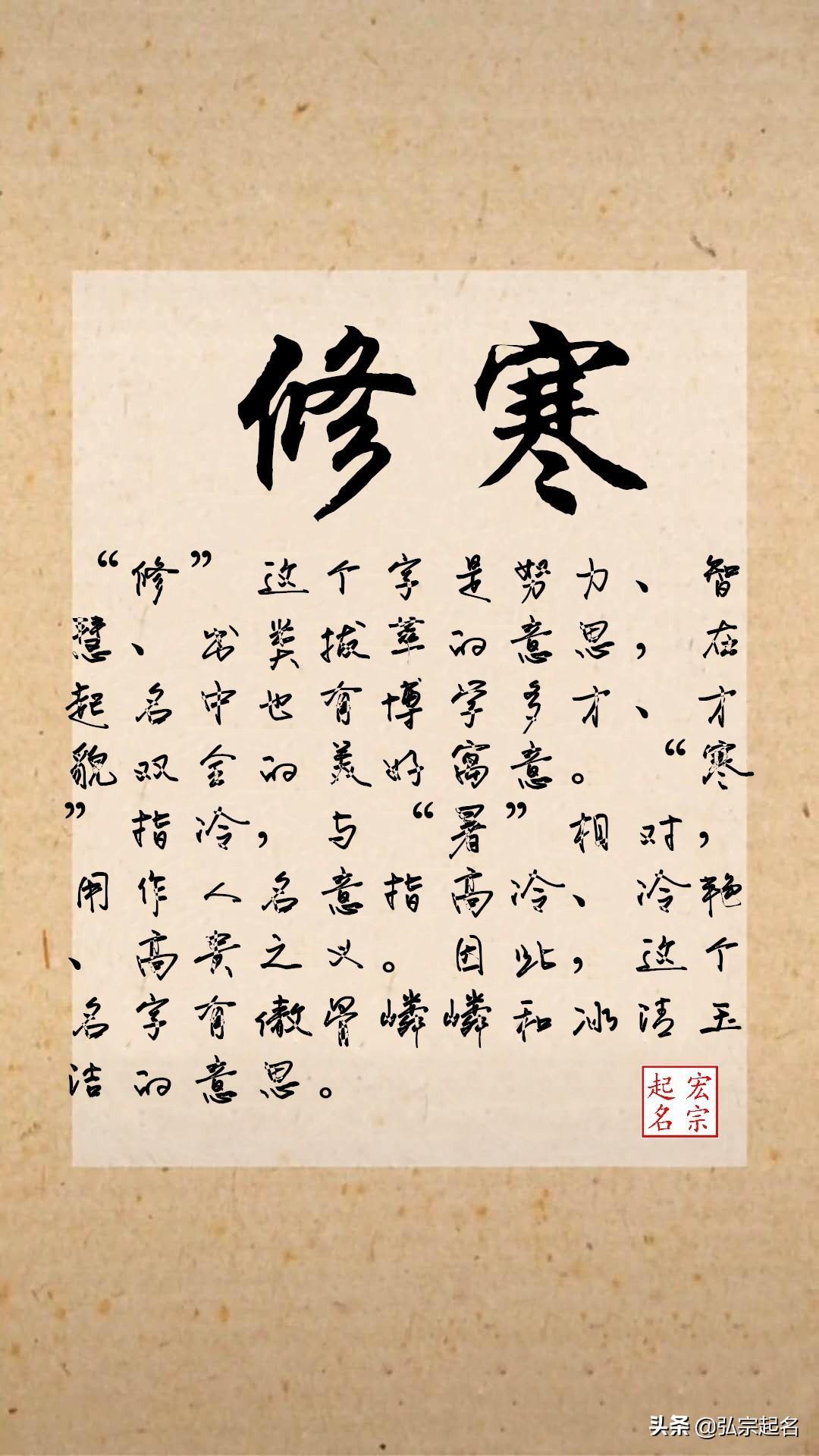 修寒寓意:“修”这个字是努力、智慧、出类拔萃的意思,在起名中也有博学多才、才貌双全的美好寓意。“寒”指冷,与“暑”相对,用作人名意指高冷、冷艳、高贵之义。因此,这个名字有傲骨嶙嶙和冰清玉洁的意思。