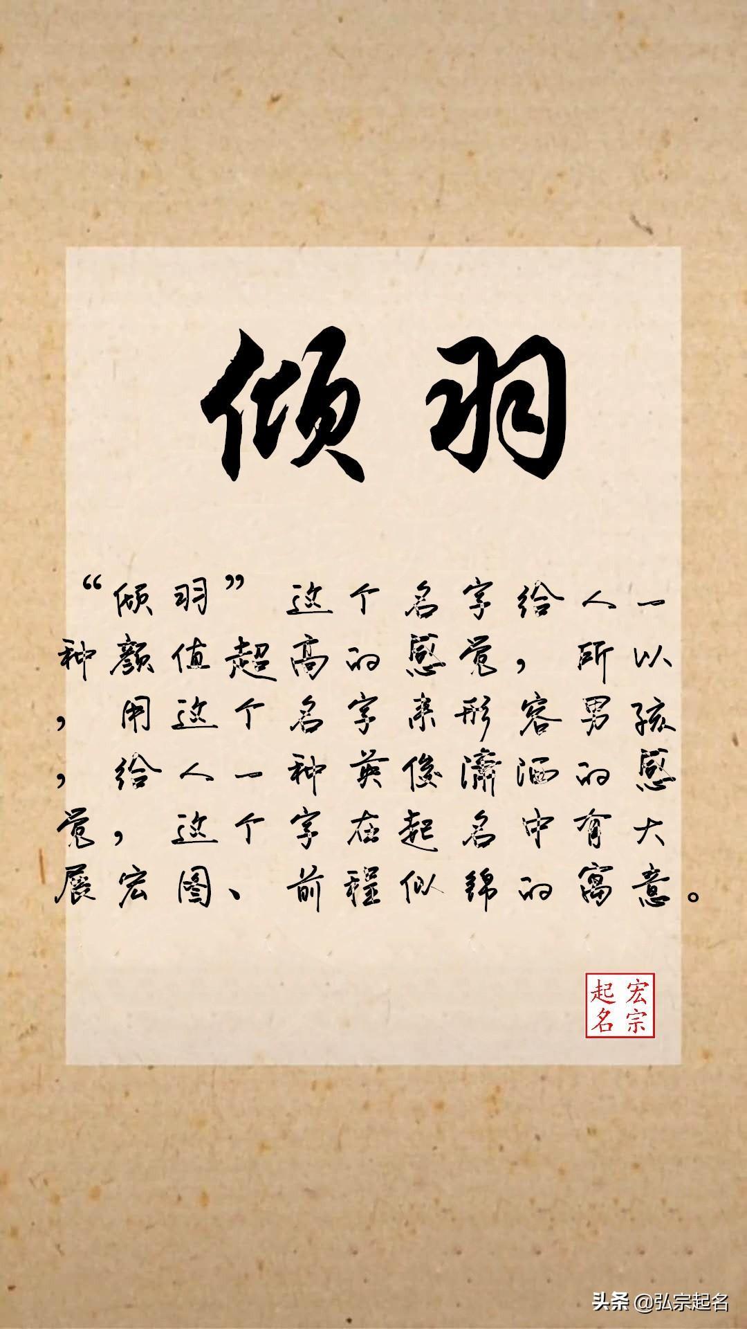 倾羽寓意:“倾羽”这个名字给人一种颜值超高的感觉,所以,用这个名字来形容男孩,给人一种英俊潇洒的感觉,这个字在起名中有大展宏图、前程似锦的寓意。