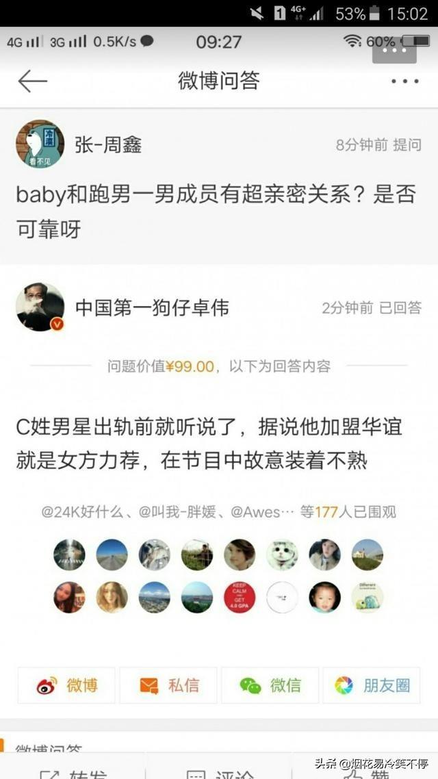 Angelababybaby过去参加节目《奔跑吧》表现虽说亮眼,但是网友很多不买账,表示太做作了,产后向节目告假,目前专心在家休养。今有网友在微博向中国第一狗仔卓伟发问:「baby和跑男一男成员有超亲密关系,是否可靠?」不料卓伟竟语出惊人表示「C姓男星出轨前就听说了」,暗指baby确实发展婚外亲密关系,而C姓男子也明显影射跑男团之一的陈赫。