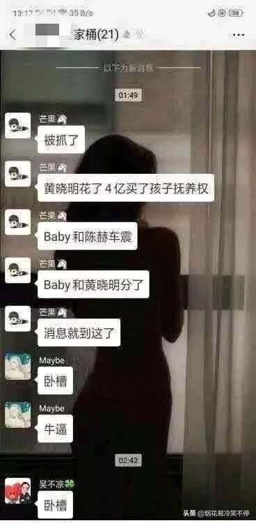 Baby和黄晓明刚用实际行动打脸谣言,又有网友曝出两人已经离婚的消息,离婚原因是Baby出轨陈赫,“车震”时被抓包,还有现场照流出,黄晓明花了4亿才抢下儿子的抚养权。