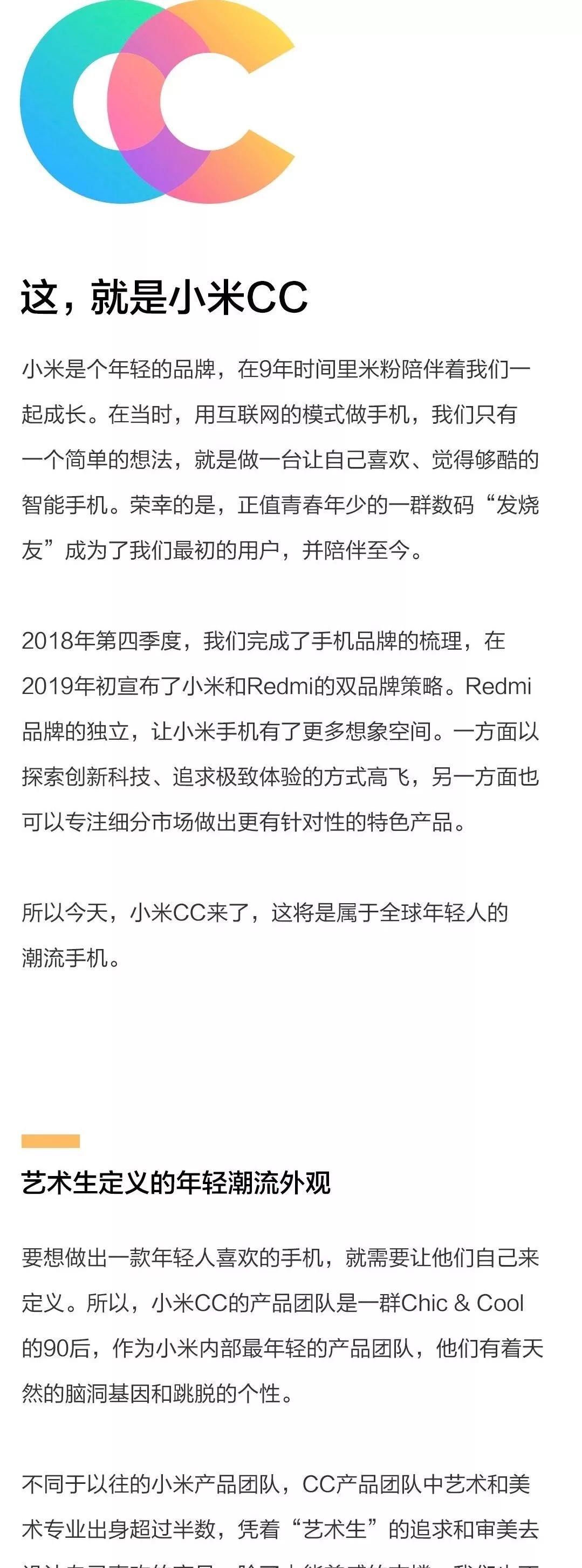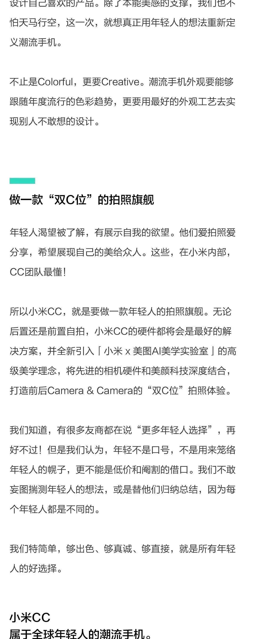 官方称,小米CC 定位年轻人群体,是一款年轻人的拍照旗舰,引入「小米X美图 AI美学实验室」的美学理念,结合先进相机硬件和美颜科技,打造无论是后置还是前置自拍,Camera & Camera “双C位”的拍照体验。
