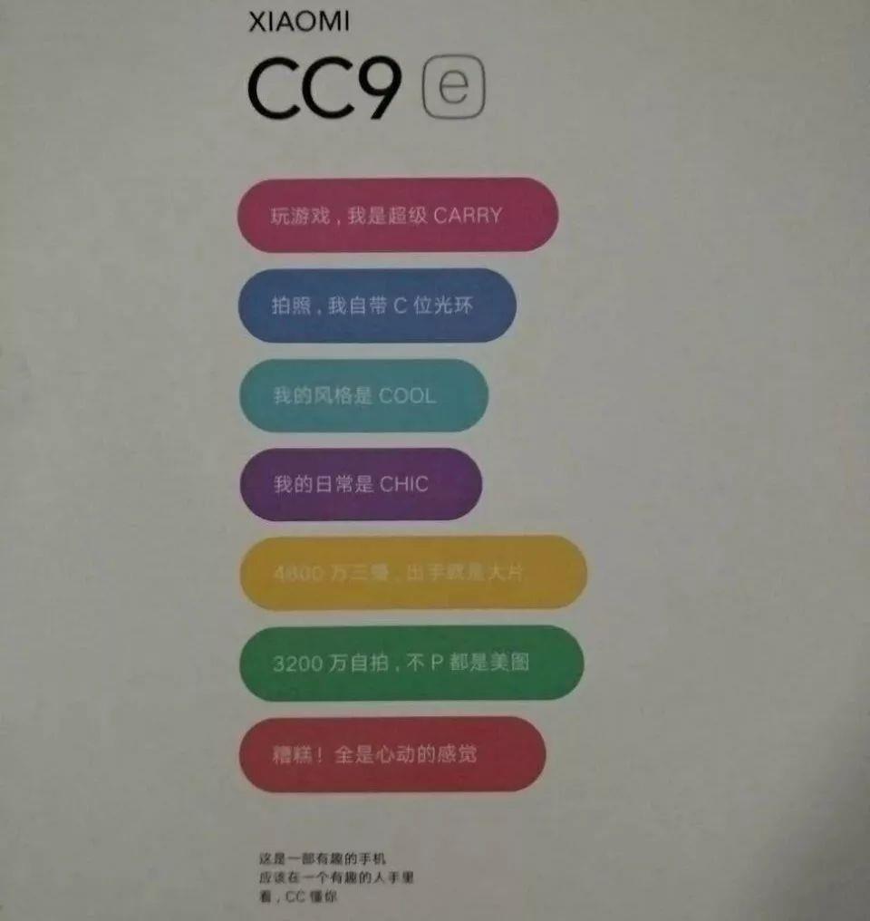 值得一提的是,日前有线下海报爆料小米新机命名为「小米CC9e」,前置3200万像素,后置4800万三摄(没加索尼,往往是三星GM1传感器),定位中端,主打自拍和性价比,但命名非常冗余,听起来也不朗朗上口,作为小米的全新产品线,个人感觉很违和。