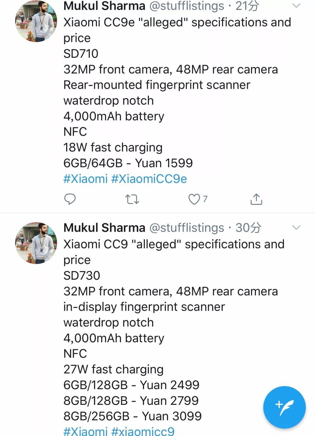 核心配置上,据爆料,小米CC9e将采用6.39英寸水滴屏,搭载高通骁龙710,4000mAh,18W快充,支持NFC,6+64GB或售价1599元;另外还有骁龙730版本,支持27W快充,6+128GB售价2499元,8+128GB售价2799元,8+256GB售价3099元。(这价格倒是美图的风格