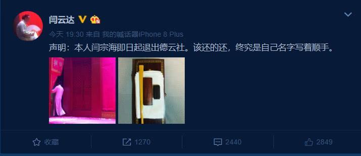 今年4月23日,闫云达在微博上发表声明,正式宣布:本人闫宗海即日起退出德云社。该还的还,终究是自己名字写着顺手。