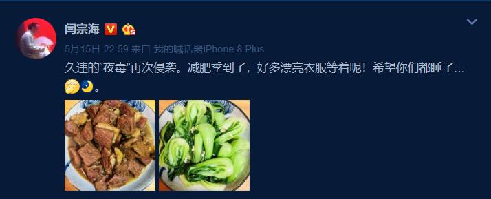 “减肥季到了,好多漂亮衣服等着呢!希望你们都睡了…”,闫宗海在微博上如此说。