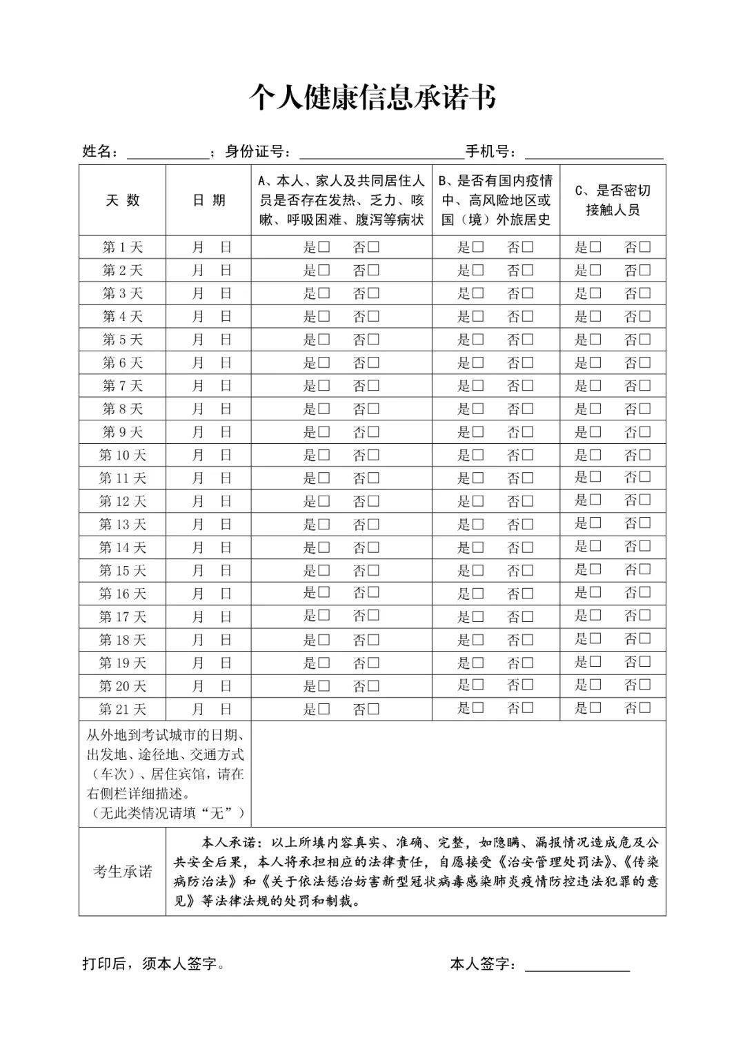 2、考生应按照准考证上确定的考试时间、地点及考场参加考试。参加考试时,必须同时携带准考证和有效期内二代身份证以及《个人健康信息承诺书》(附件3),缺少证件的考生不得参加考试。