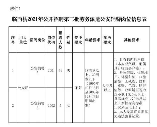 1、本次计划公开招聘64名警务辅助人员,招聘的岗位、数量和条件具体详见《临西县2021年公开招聘第二批劳务派遣警务辅助人员岗位信息表》(附件1);