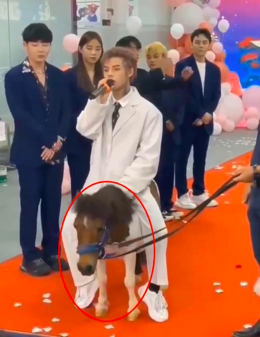 马的头还是棕色的,殷世航骑上去脚都能碰到地面,整个出场实在是太滑稽了。