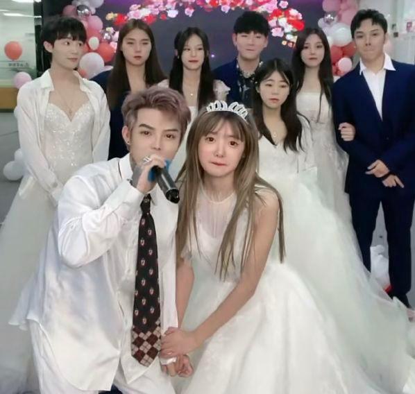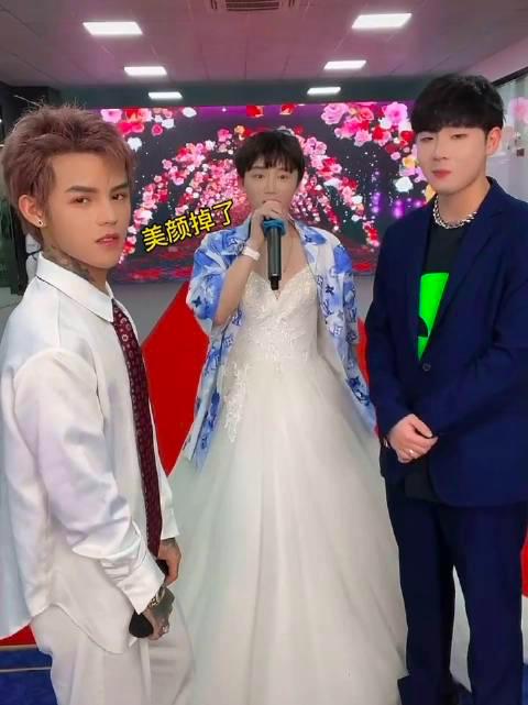 伴郎伴娘入场,他们也都是抖音上的网红,比如拥有千万粉丝的小李朝,这次男扮女装,颇有看点。