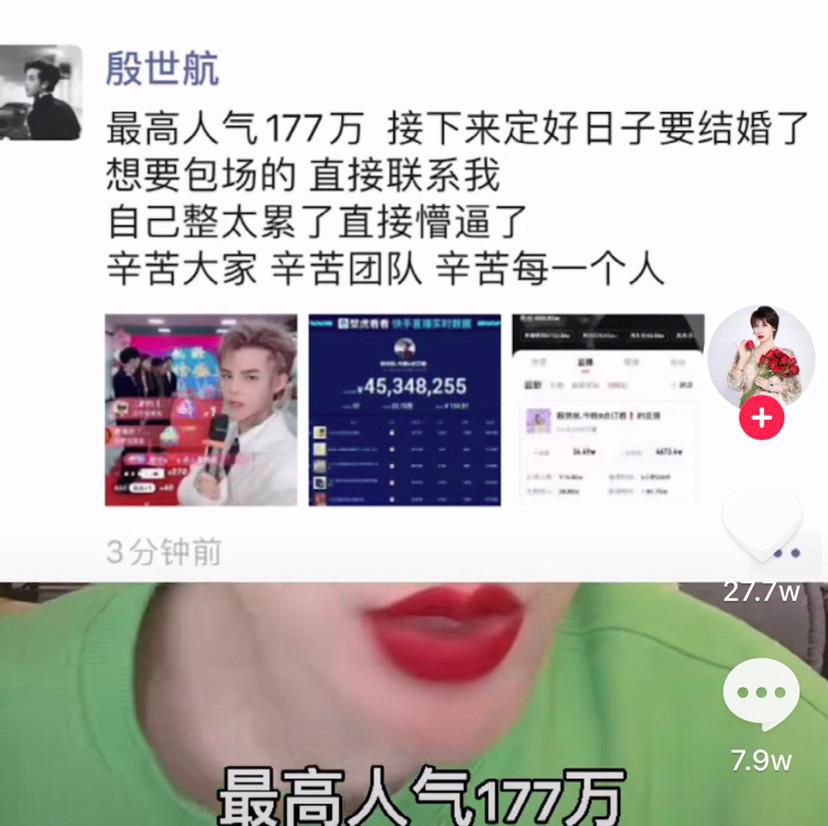 有位同样是网红的主播不禁感叹道:“其实殷世航才是真正最聪明的人,人家直播时长5小时20分钟,就赚到了99.99999%的人一辈子都赚不到的收入!”