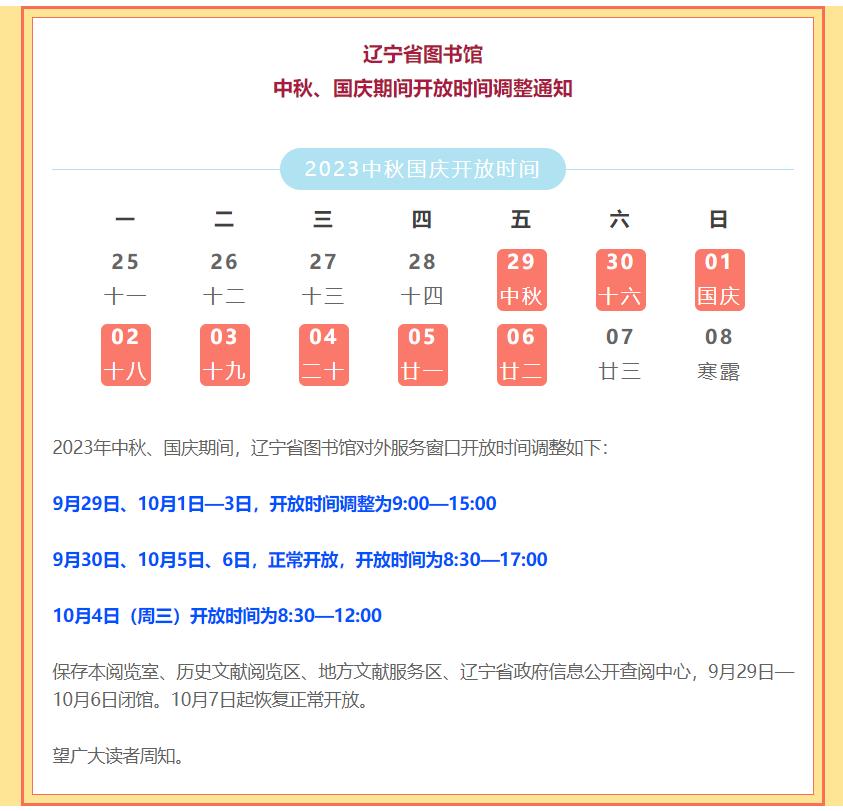 2023年中秋及国庆节放假期间,沈阳市图书馆对外服务窗口及开放时间调整如下: