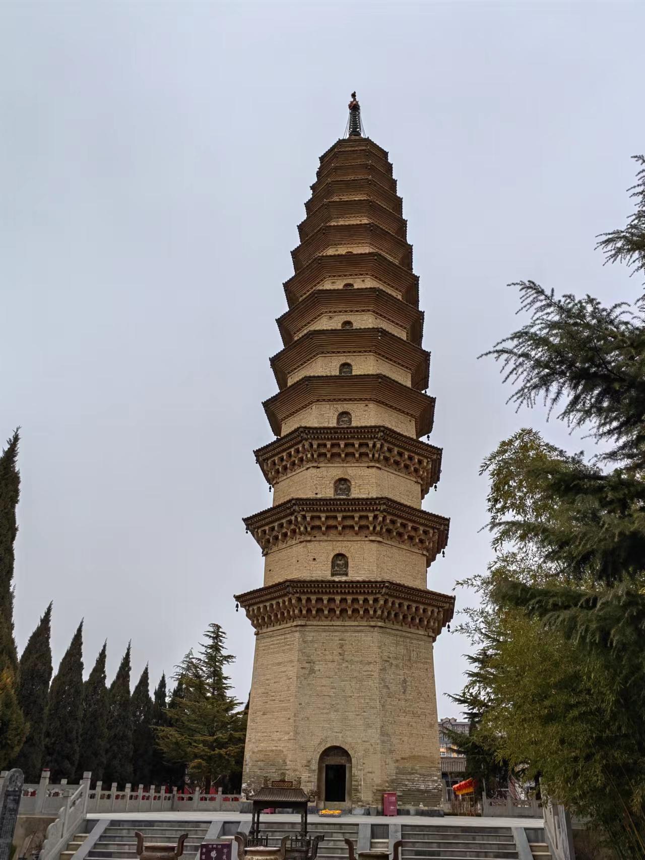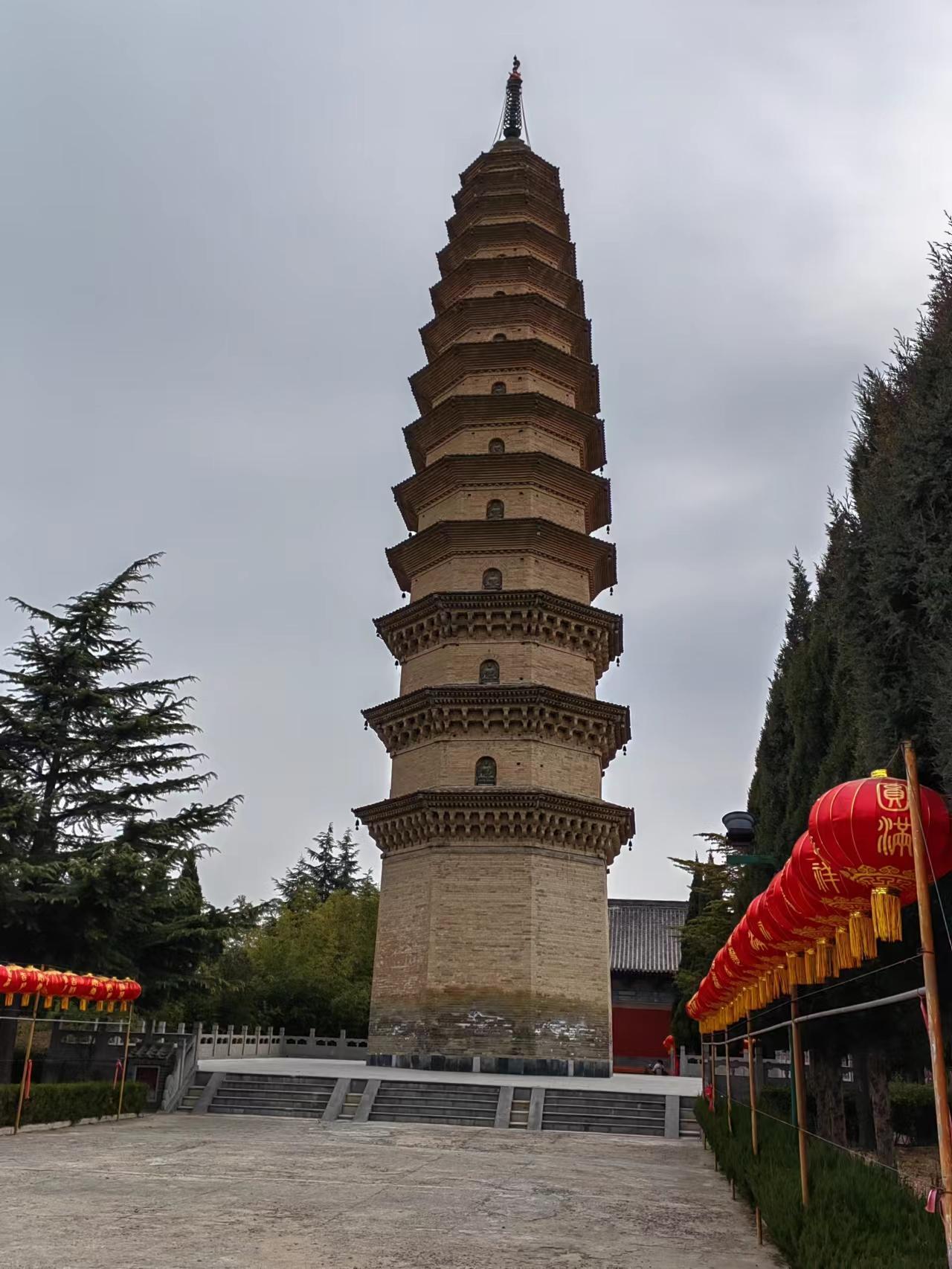 离开广仁王庙,继续向南前行约2公里,是芮城县内另一出全国重点文物保护单位圣寿寺舍利塔。圣寿寺始建于东汉永平年间,北宋天圣年间造塔供奉佛舍利,因而又称之为舍利塔,后明清两代均有重修。寺内大部分建筑随着时间已消逝于茫茫的历史长河中,仅存的一座建筑是明代修建的圣寿寺舍利塔,该塔为砖砌八角密檐式,共十三层,约高48米。塔身一层最为高大,向上逐层收分呈锥形,每层八角密檐,一至三层檐下砖雕斗拱,仿木结构形制。首层朝南设门,可进入塔心室,二层及以上四面壶门或龛,龛内供奉佛像。塔内中空,各层原有楼板,可缘梯攀登,现已不存,塔内保存有部分宋代壁画,内容为佛,菩萨和供养人等,面形秀润,线条流畅,因烧香污染,色泽陈旧,但其宋代画风依稀可见。为保护文物,塔内已不让进入,尽可外观舍利塔的巍巍雄姿。