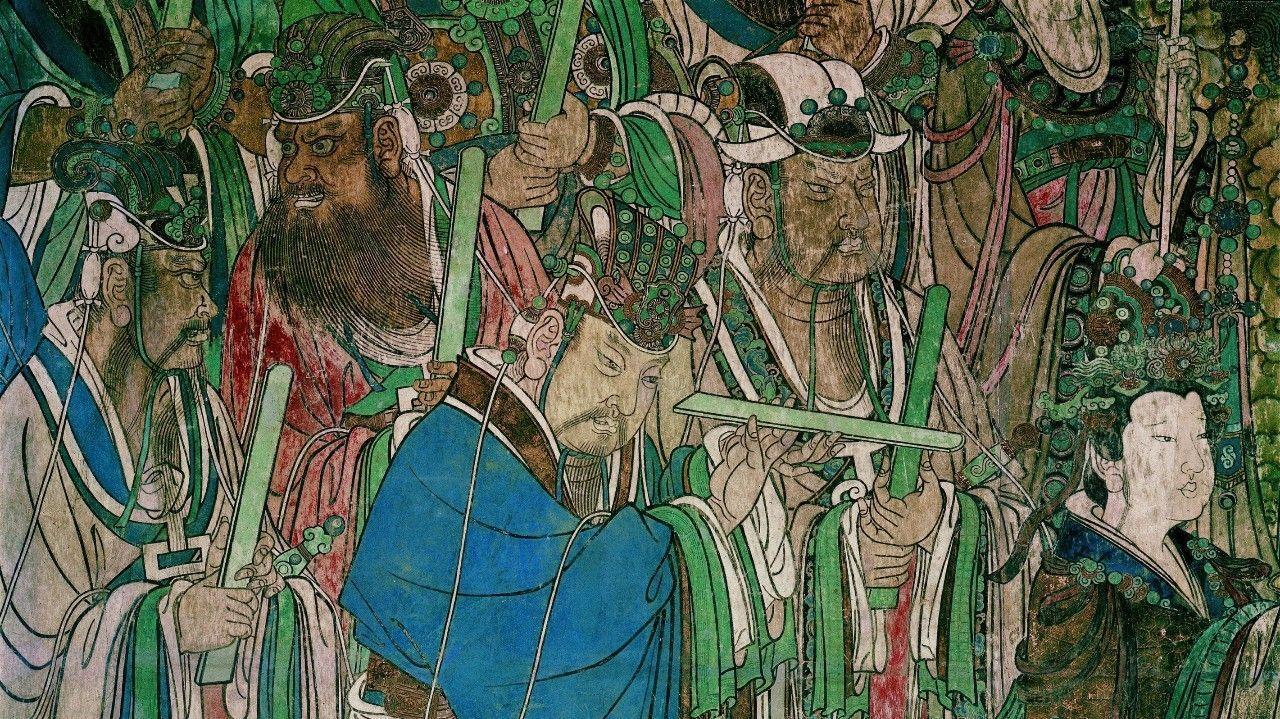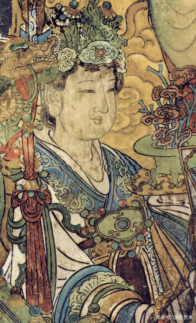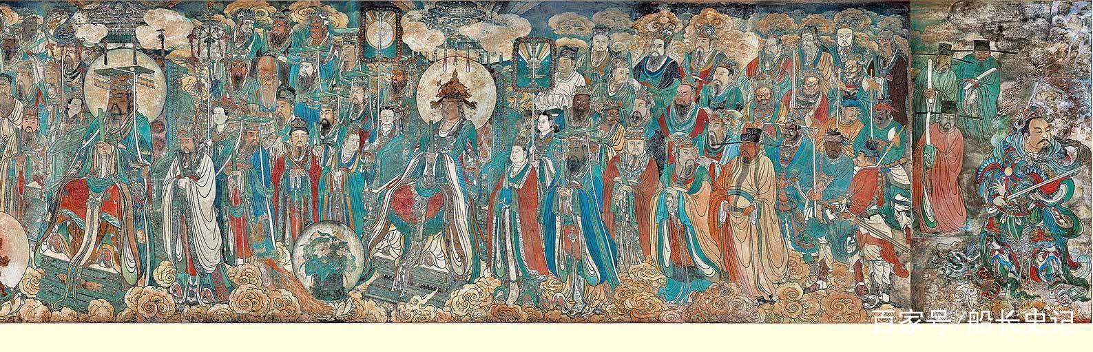 永乐宫的壁画满布在四座大殿内,壁画总面积达960平方米。《朝元图》描绘的是群仙朝谒元始天尊的情景:青龙、白虎两神为前导,南极长寿仙翁和西王母等八个主神的四周,簇拥了雷公、电母、各方星宿神及龙、蛇、猴等多位神君,另有武将、力士、玉女在旁侍奉,全图近300个神仙朝着同一个方向行进,形成了一道朝圣的洪流。在用色上,采用了传统的重彩勾填方法。