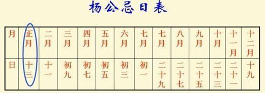 收杨公第一个儿子是正月十三这天,于是每个月杨公都会没一个儿子,并且时间很有规律,就是每月里往前赶两天。从正月十三开始,二月十一,三月初九,四月初七,五月初五,六月初三,七月初一,七月二十九,这里要说一点,刚好那年闰七月,所以七月有两天。八月二十七,九月二十五,十月二十三,十一二十一,十二十九,这样阴历闰七月,这年共有十三个月,这样杨公的十三个儿子都没了,这样杨公为他的狂妄埋单了。后来人们就把杨公十三个儿子没的日子称为“杨公十三忌”,人们挑选日子都避开了。