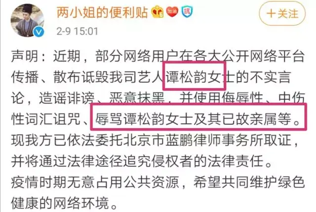 近日就有部分网络用户在各大公开网络平台散布女明星谭松韵的不当言论,除了重伤本人以外,更是对谭松韵已故的亲属进行辱骂。2月9日,谭松韵的工作室就这一系列的网络造谣诽谤正式作出了回应声明: