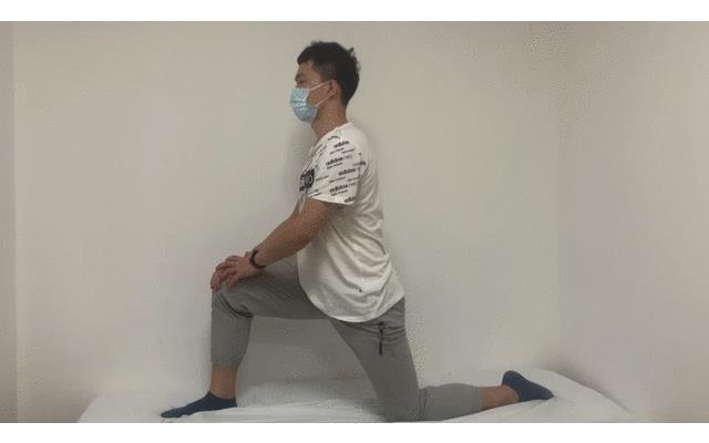 躺姿时,抱膝尽量弯曲一侧髋膝,另一侧靠近床边垂于床沿;也可以采用分腿跪姿,背部挺直,一侧弓步在前,一侧屈膝髋后伸,膝盖触地。如下图。