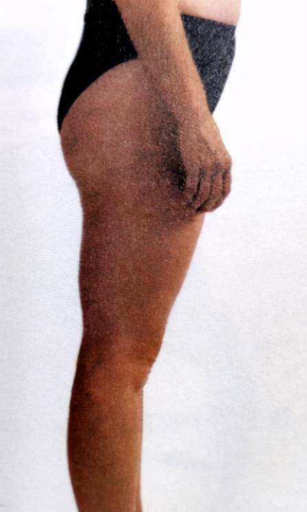 我们可以看看下图,侧面看,骨盆上端的髂前上棘向前超过耻骨,而不是排成一直线。当下肢固定,骨盆前倾还会造成髋部屈曲,假翘臀,腰椎前凸角度增加,假小肚子。