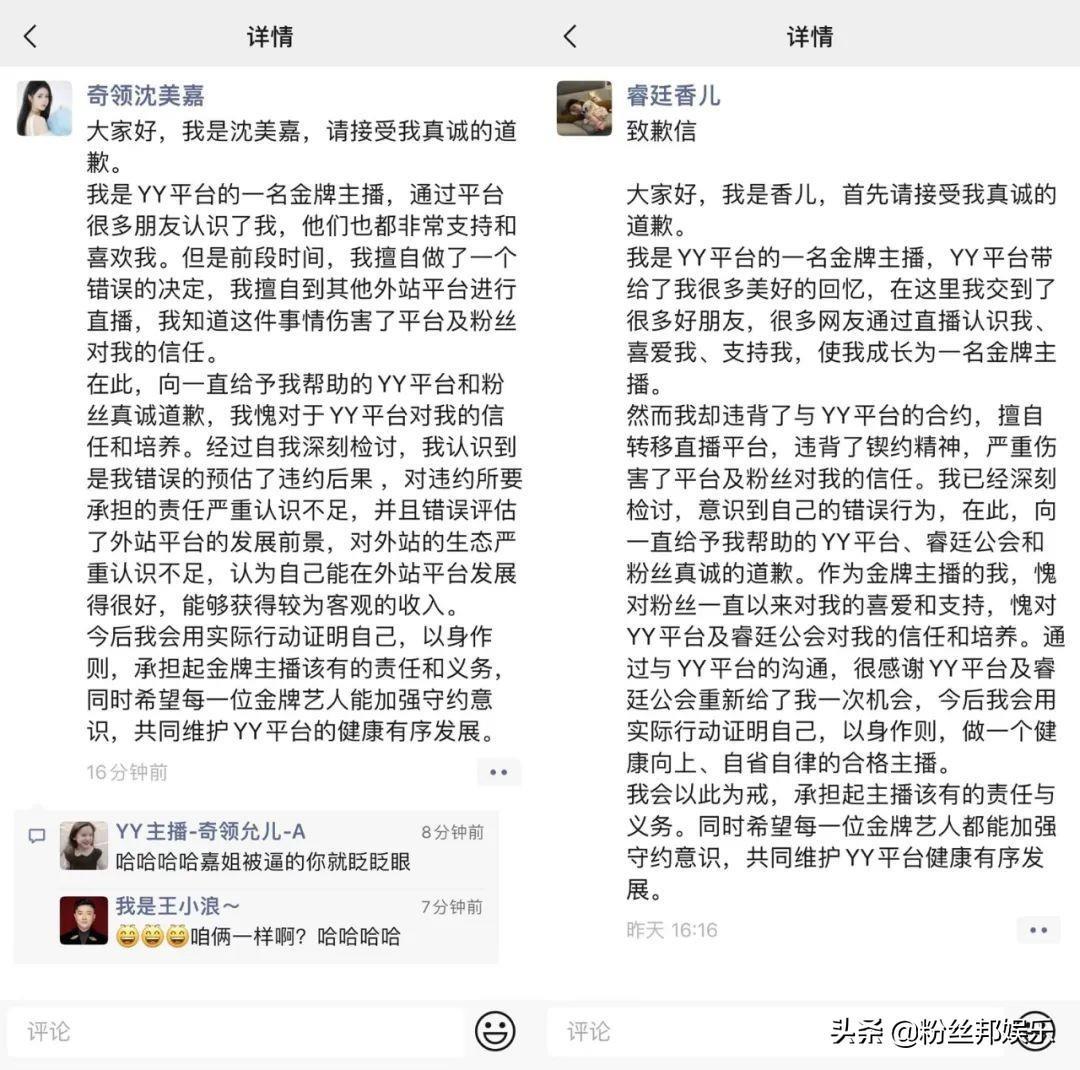 此次除了王小浪之外,还有奇领沈美嘉、睿廷香儿两位女主播同样发布了致歉信,看样子情况应该和王小浪差不多。