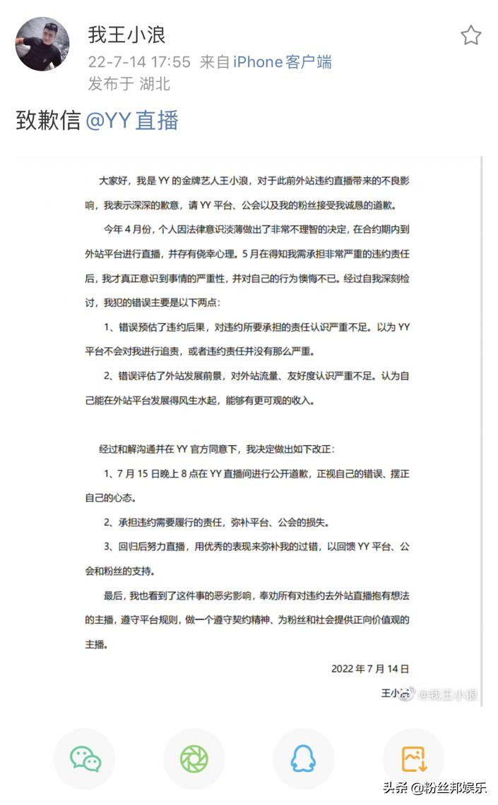 王小浪还公开发布了给YY直播的“致歉信”,直言自己抱着侥幸心理违约,错误预估了违约后果,错误评估了外站发展前景。