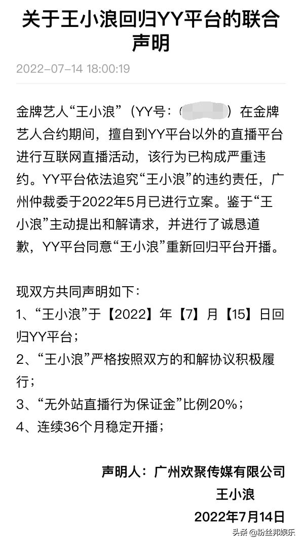 而就在近日,YY直播发布关于“金牌艺人”王小浪外站违约的立案情况通报后,再次发布了《关于王小浪回归YY平台的联合声明》。