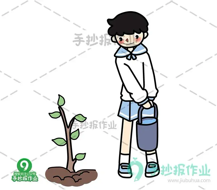 接下来涂色,男孩穿着蓝白校服,涂上淡淡的肤色,画上粉脸蛋,水桶用灰色修饰,浅蓝色的水,然后给树和土壤涂好颜色~