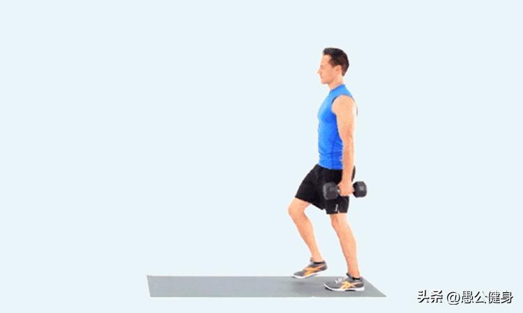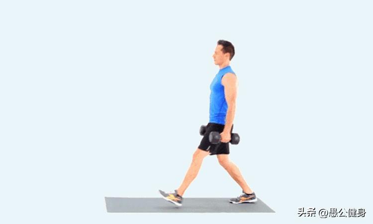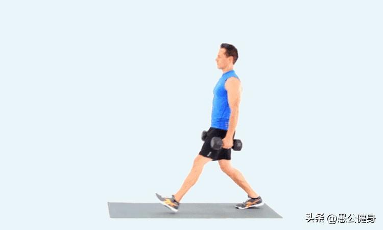 动作1 以右脚前脚掌蹬地、左腿向前迈出一大步,双手下垂持哑铃跟随,脚跟先着地踏稳,再弯曲膝关节身体下蹲。