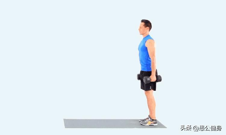 起始 双手握哑铃下垂于身体两侧,双腿直立站稳,挺胸立腰,目视前方。