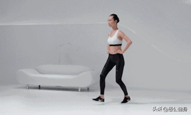 动作4 以前脚掌先着地,将左腿撤回至起始位;和左腿动作同,此时再换右腿向前迈出一大步。